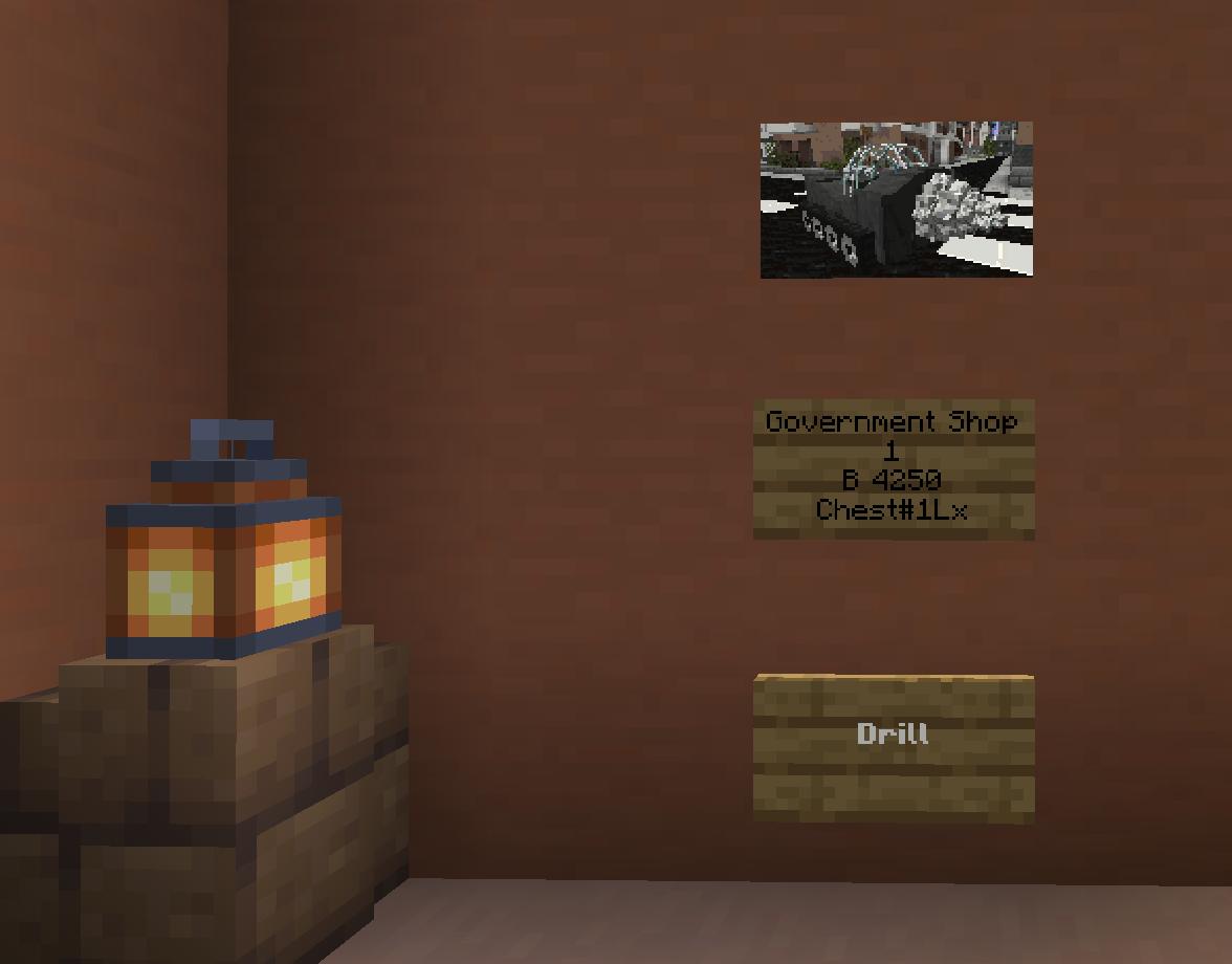 A shop sign that allows Miners to buy drills, located at the Government Mall.